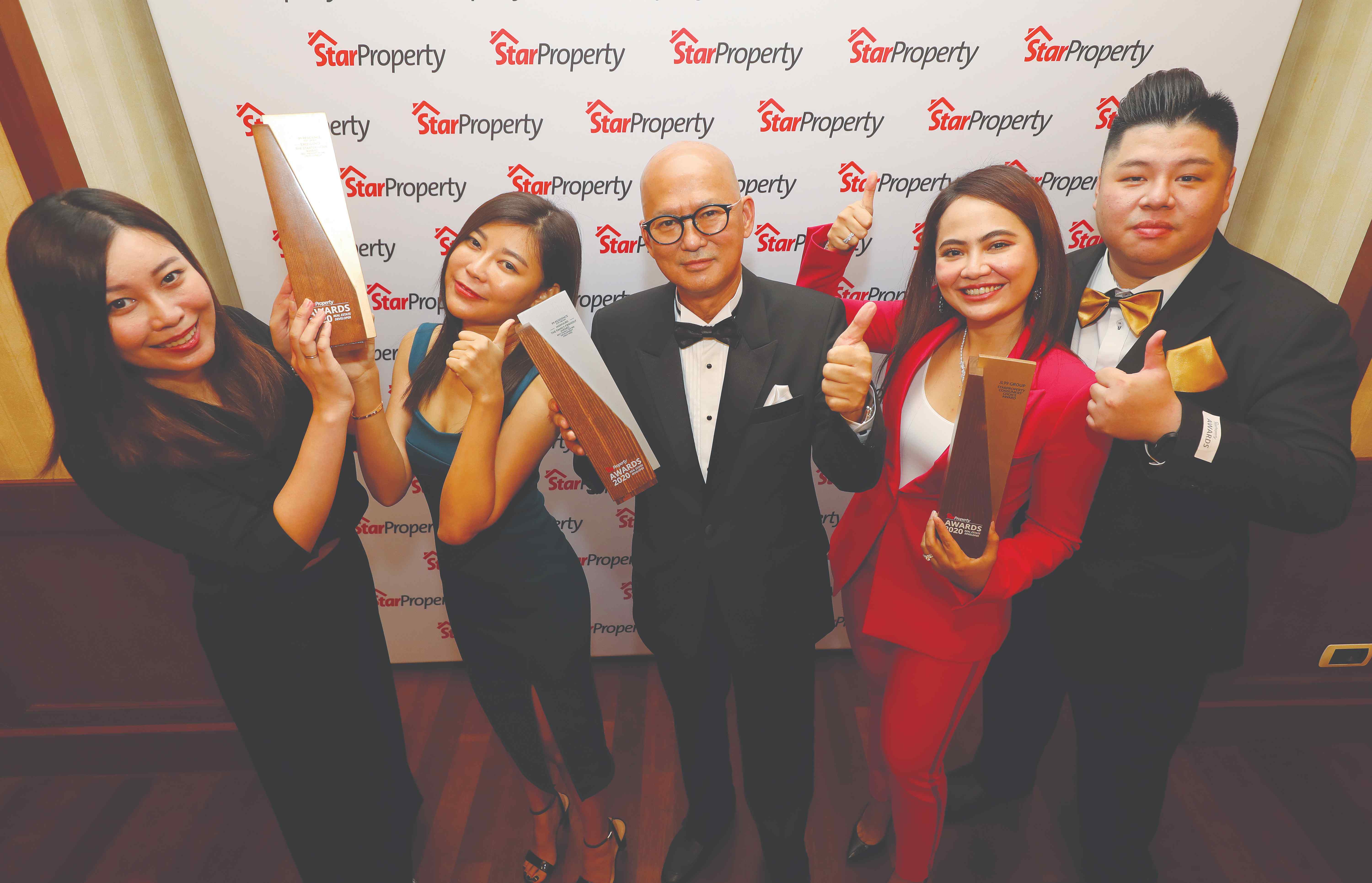 Giving the thumbs up after YNH Property bags three trophies are (from left) Yap, YNH property contract manager How Kean Lok, assistant development manager Yu Chong Cheng, corporate strategy general manager James Ngio, marketing manager Alyz Yeap, development manager Teo Ling Piau and Fu.