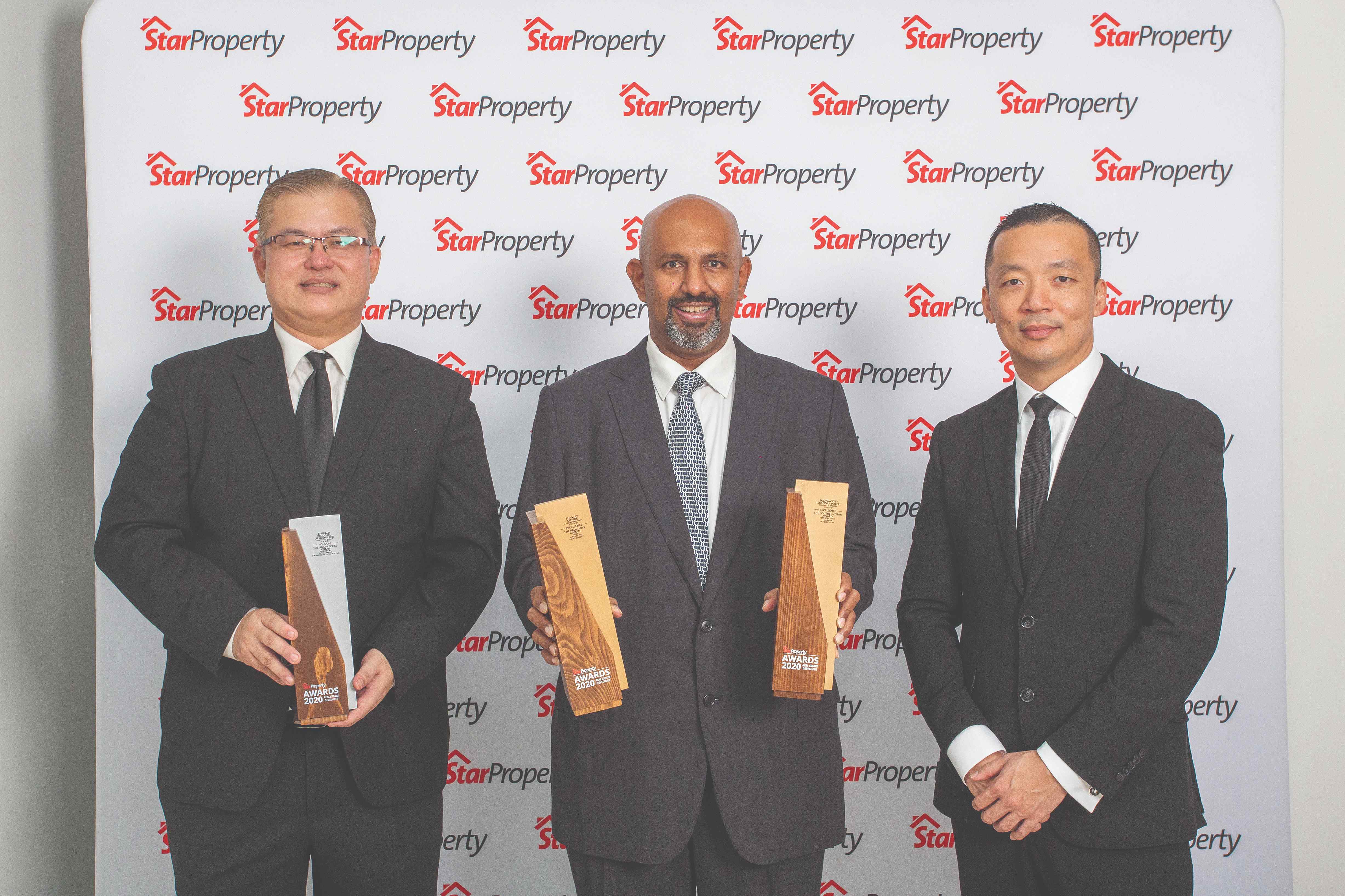 Sunway City Iskandar Puteri CEO Gerard Soosay (centre) and assistant general manager Ng Chai Teck (left) hold up their trophies as Yap looks on.