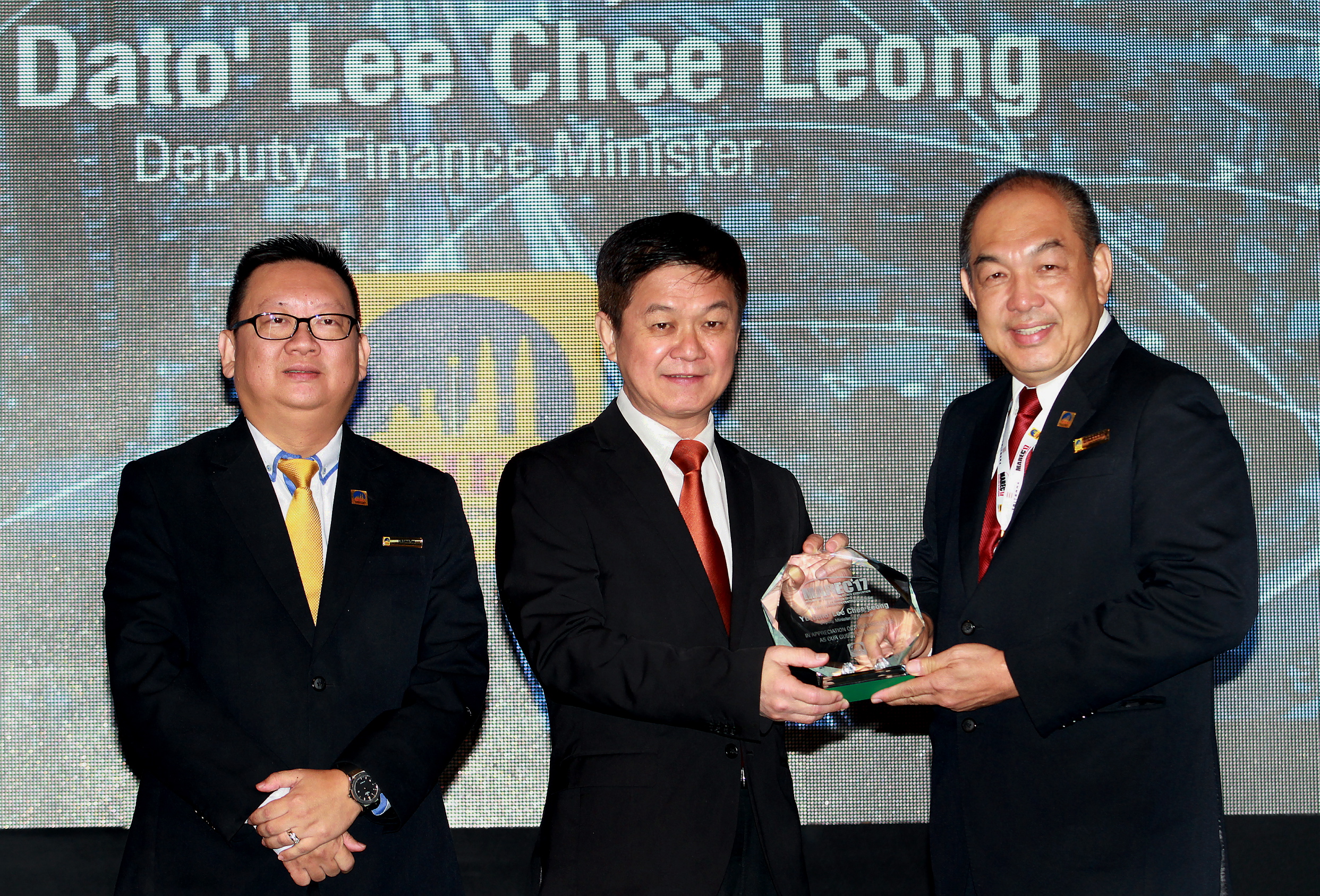 Erick Kho (right) presenting a token to Lee Chee Leong (center) after the opening of the (MAREC'17) at Setia City Convention Center in Shah Alam. On the left is Lim Boon Ping.