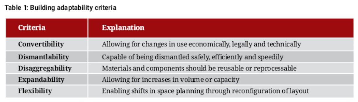 Not all buildings are adaptable and a building suitable for adaptation would generally meet certain key criteria (see table 1). It must possess convertibility, allowing for changes in use economically, legally and technically. It should have dismantlability, meaning it is capable of being dismantled safely, efficiently and speedily. Disaggregability is also required so that materials and components can be reused or reprocessed. Furthermore, it must offer expandability to allow for increases in volume or capacity and flexibility to enable shifts in space planning through the reconfiguration of layouts.