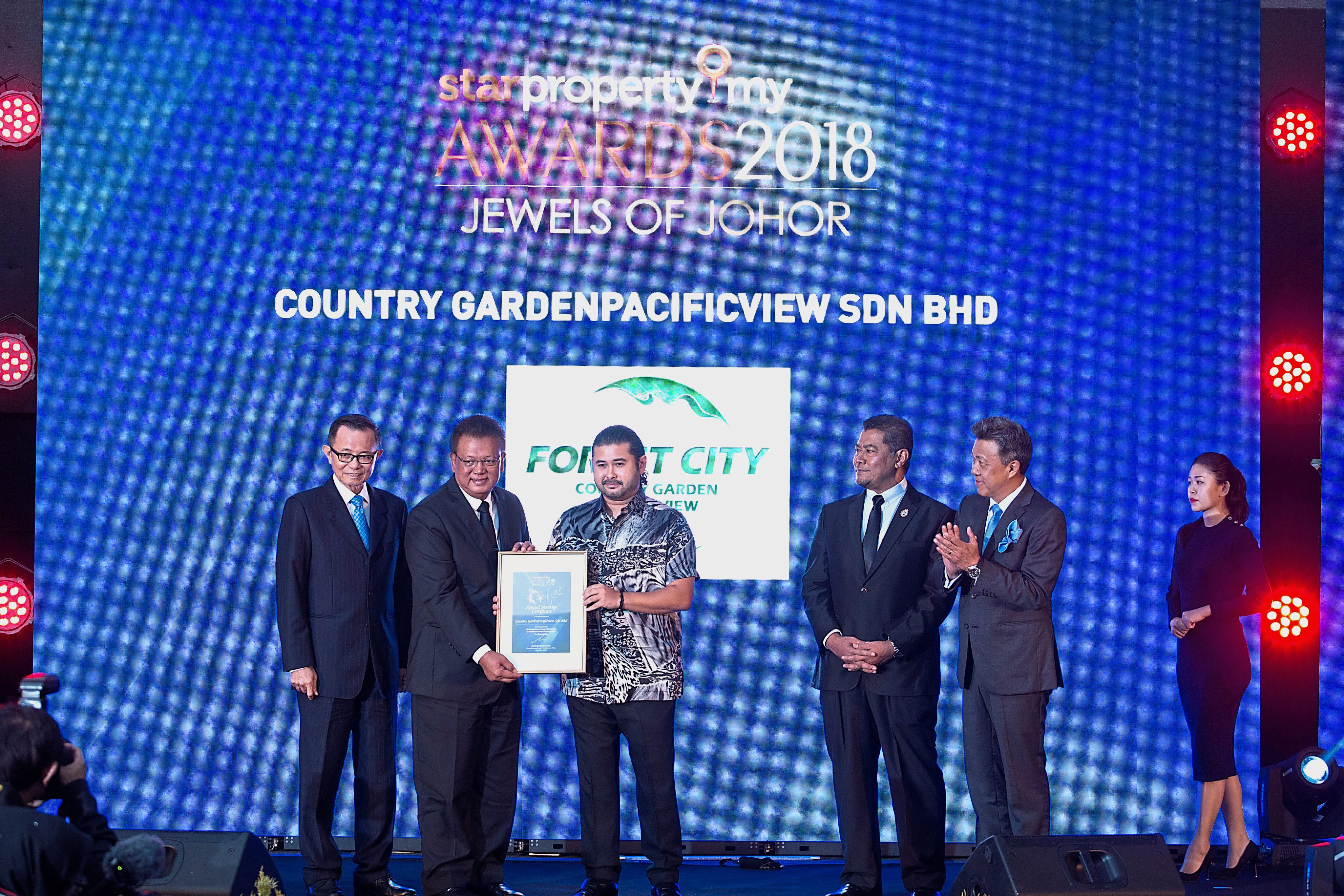 Country Garden PacificView Sdn Bhd executive director Datuk Md Othman Bin Hj Yusof receiving the special mention category from Tunku Ismail, while Star Media Group chairman Datuk Fu Ah Kiow (left) and Johor Housing and Rural Development Committee chairman Dzulkefly Ahmad and Datuk Seri Wong Chun Wai look on.