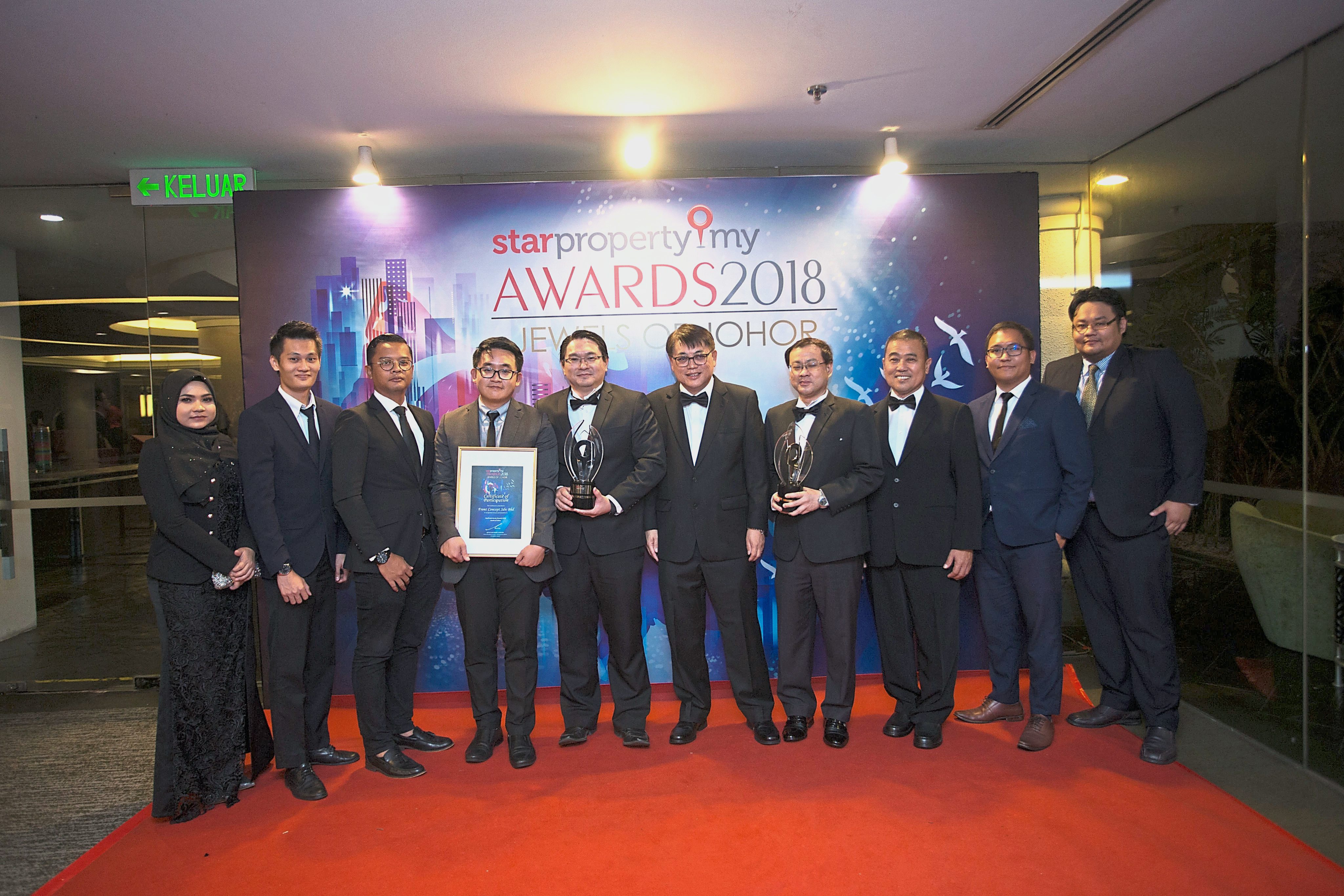 (fourth from left:) Front Concept Sdn Bhd marketing executive Julian Seow, assistant general manager Chan Wei Chun, project director Quay Chew Keong, general manager Ling Ngie Soon and the team posing with their trophies at the StarProperty.my Awards 2018: Jewels of Johor.
