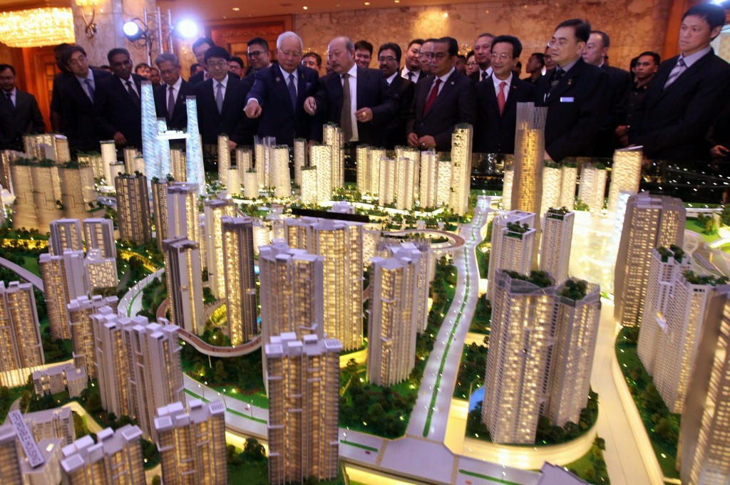 Prime Minister Datuk Seri Mohd najib tun Razak being briefed by Executive Vice Chirman of Iskandar Waterfront holdings Tan Sri Lim Kang Hoo ( fourth from right ) at the signing ceremony for bandar Malaysia development in Kuala Lumpur. Also present are from left Datuk Wee Kar Siong, China's Ambassador Huang HuiKang , Johor MB Datuk Seri Khalid Nordin.