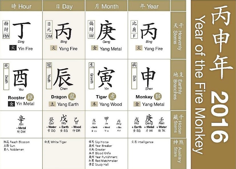 3) Another half combination is also formed between the Shen (Monkey) and You (Rooster) in the Hour Pillar, which belongs to the Metal element. This represents an increase in wealth, power and influence.