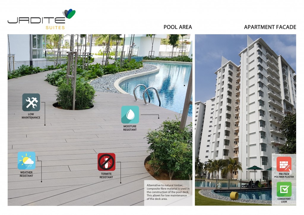 In constructing Jadite Suites, a low-density development with full condo facilities, Gamuda Land has introduced new material innovations to improve the quality and look of the building facades, as well as the durability of the common facility area.