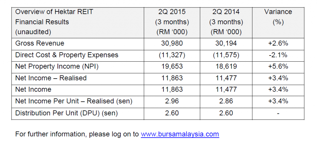 Hektar REIT declared an interim distribution per unit of 2.60 sen, maintained as per the distribution declared in the previous year’s corresponding quarter. The Book Closing Date is September 3, 2015 and payment of the distribution will be made on September 18, 2015. Based on the closing price of RM1.50 on June 30, 2015, DPU for the year represented