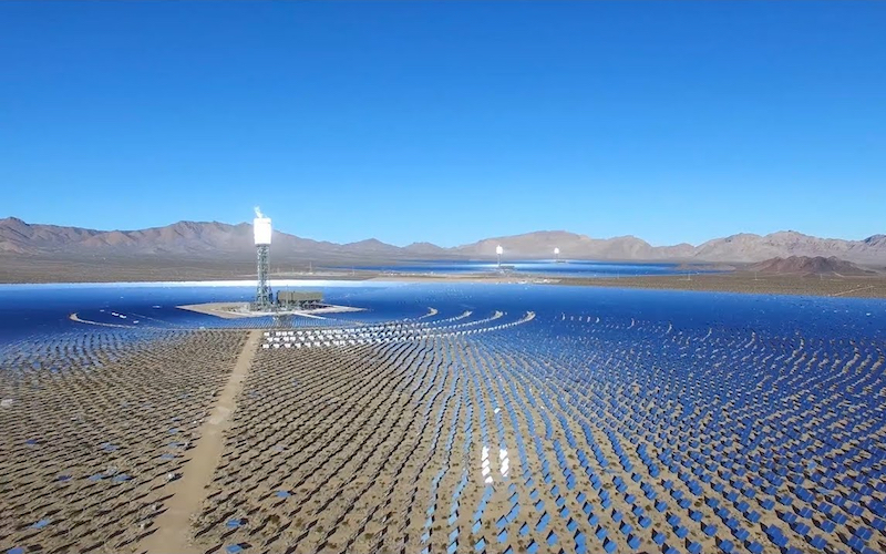 The geodesic domes and the structural mesh upon them combine tension and compression for structural efficiency.