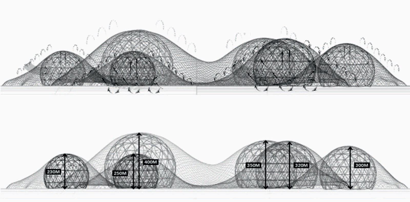The hills come with a height ranging from 230 to 400 metres, with a mega geodesic sphere placed within it to form the core. Estimated to house around 300,000 residents in total, residential units are built horizontally, wrapping around each dome in concentric circles. This innovative concept is divorced from the old building designs where each building is built vertically and independently on a two-dimensional grid.