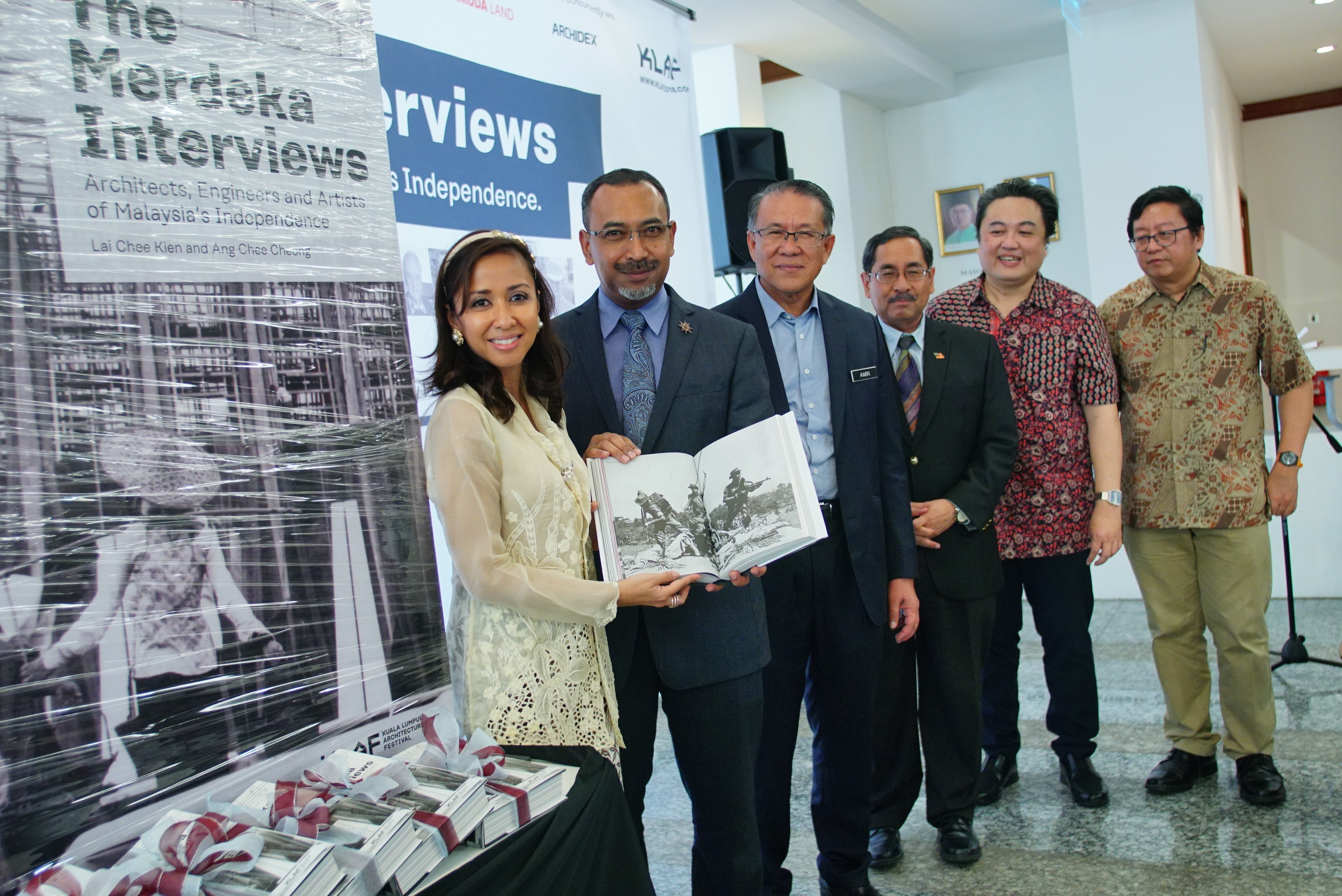 From left: KLAF Royal Patron Y.A.M. Tengku Datin Paduka Setia Zatashah Sultan Sharafuddin Idris Shah, Pertubuhan Akitek Malaysia (PAM) president Ar. Ezumi Harzani Ismail, Mayor of Kuala Lumpur Tan Sri Hj. Mohd Amin Nordin Abd. Aziz, Lembaga Arkitek Malaysia (LAM) president, Ar. Zairul Azidin Badri, and ‘The Merdeka Interviews’ editors Ang Chee Cheong and Dr. Lai Chee Kien.