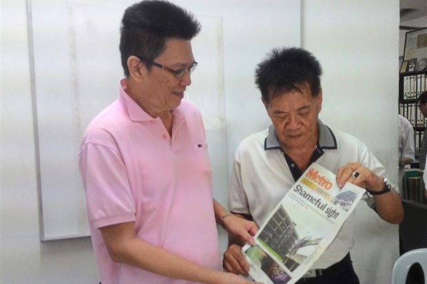 Wanting progress: Ong (left)and Yong looking at one of the many newspaper reports on the abandoned Plaza Rakyat project that had yet to be revived after 18 years.