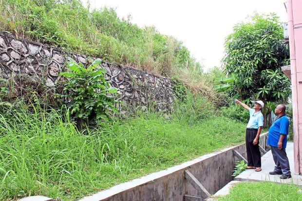 Neglected: (From right) Adnan and Md Yusup showing the grass at the back of their apartment which has not been cut for two years. — NORBAITI PHAHARORADZI/The Star.