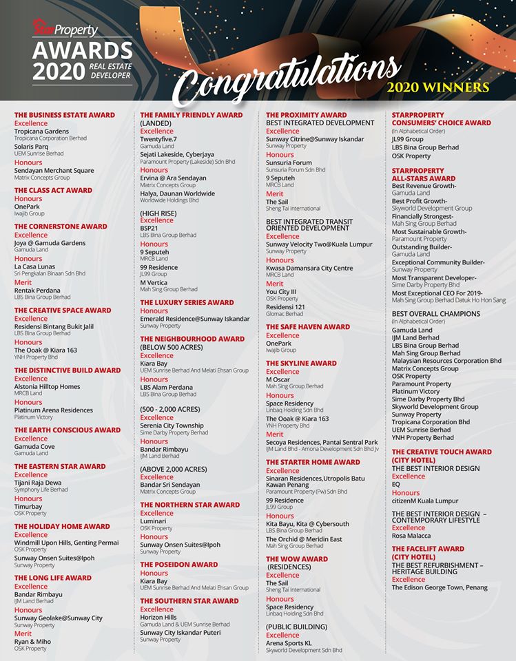 Winners of the StarProperty Awards 2020 were announced on March 27 via a special awards pullout in The Star Newspaper, as well as on various online channels.