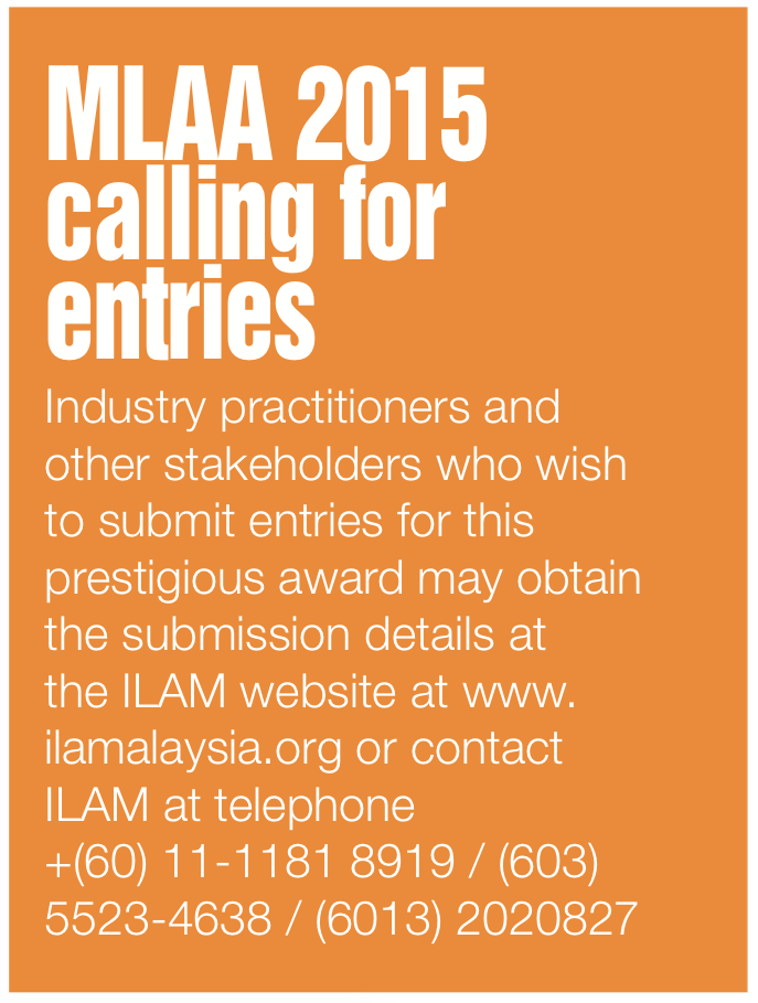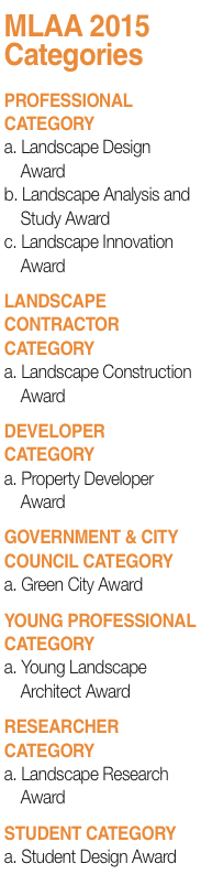 for projects completed in Malaysia and abroad, to honour the best in landscape architecture from various aspects of the industry. The organiser has also added a new category, Young Landscape Architect Award, to the list of award categories for MLAA 2015, to recognise the achievement of outstanding individual young landscape architect.