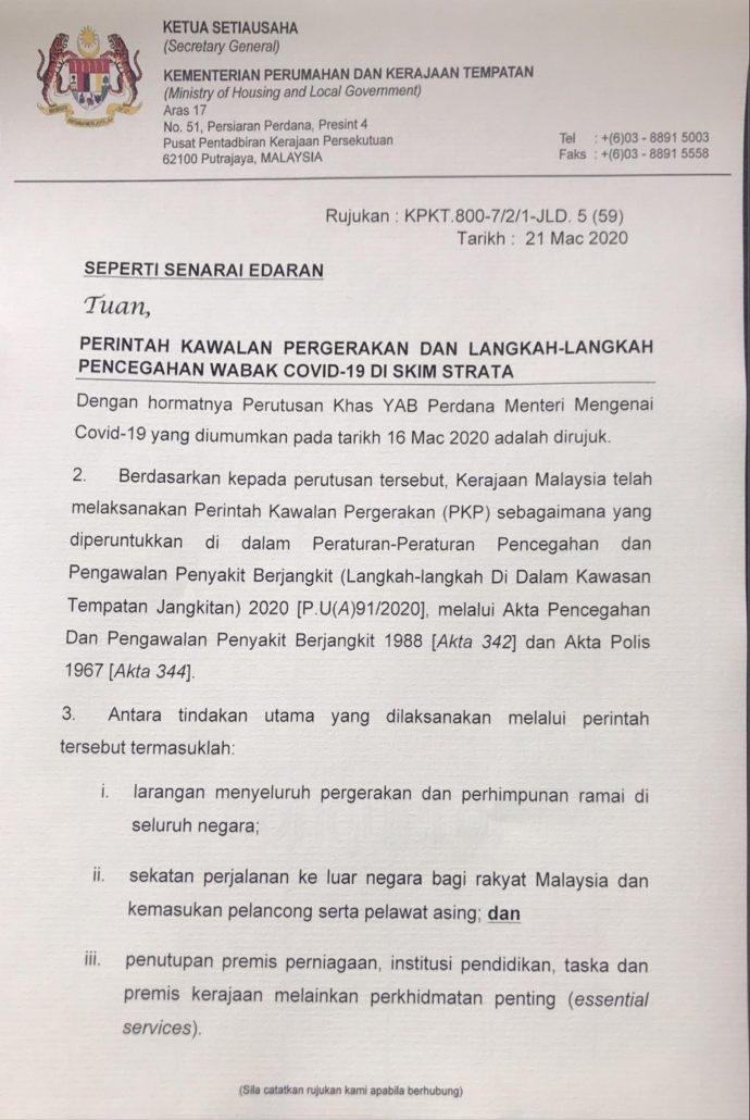 The Ministry of Housing and Local Government, abbreviated as KPKT, recently issued a circular to provide clarity to joint management bodies (JMBs) and Management Corporations (MCs) as to the operations within a stratified development during the movement control order (MCO).