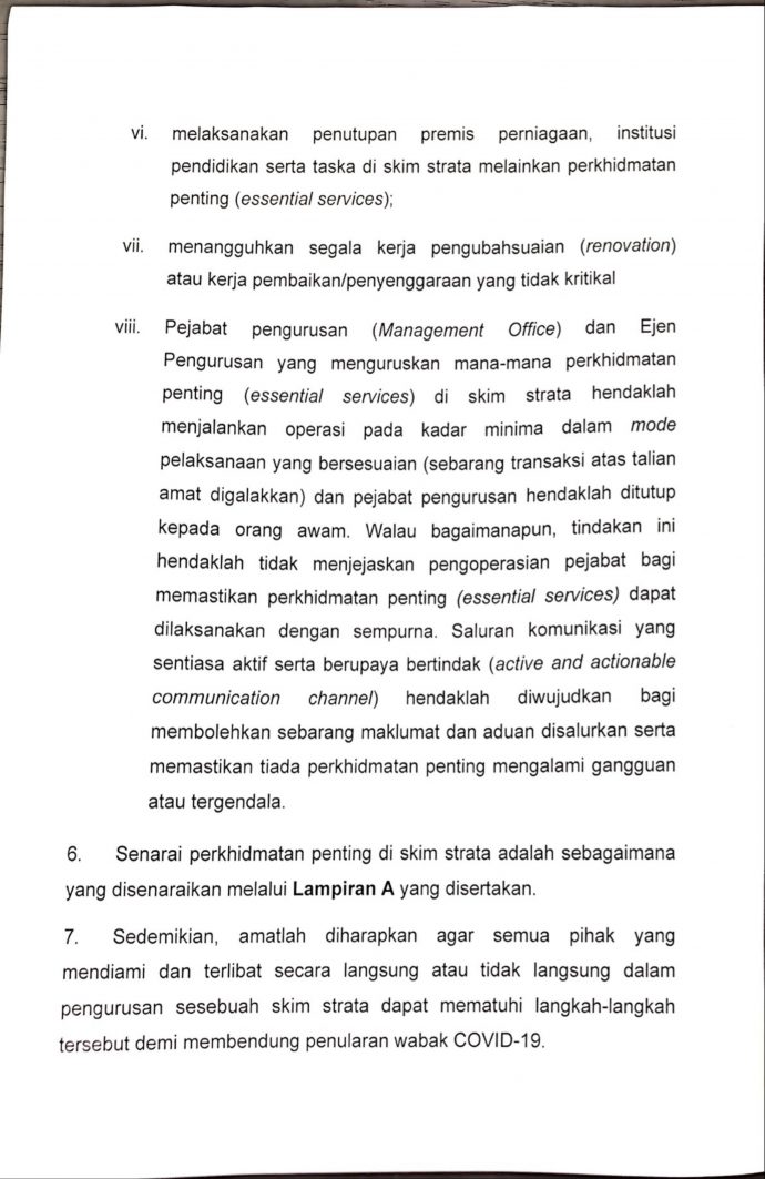 8. The Management Office and Managing Agent or Property Manager who is involved in providing essential services in a strata scheme shall operate within the minimal rate on an execution method which fits best during the MCO period. All Management Office is to shut down to the public. The underlying objective is to maintain an active and actionable communication channel to ensure the provision of essential services are not interrupted.