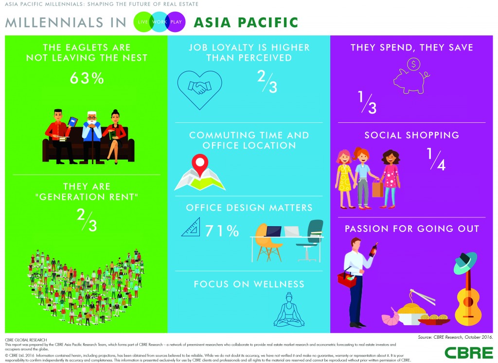 The findings have serious repercussions. According to CBRE Asia Pacific head of research Dr Henry Chin, “Millennials represent the fastest source of spending power regionally and serve as the most influential demographic framing future trends in real estate through their lifestyle behavior, requirements and priorities of living, working and play.”
