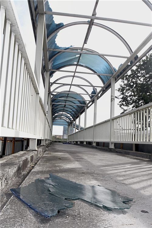 AN overhead pedestrian bridge along Jalan Masjid Negeri in Penang, has become an eyesore with its roof damaged, exposing the walkway to the sun and rain.