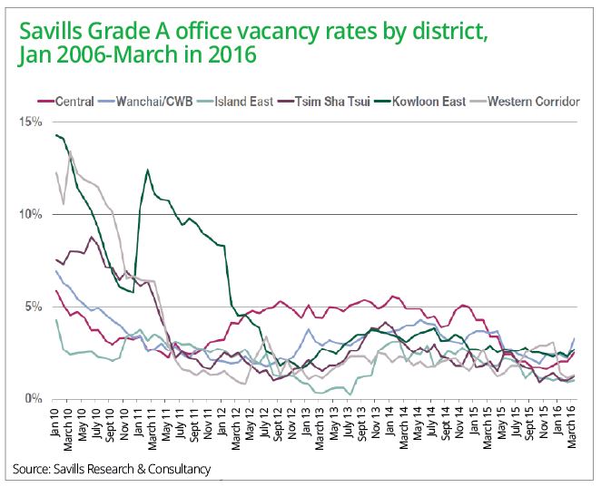 In Sheung Wan, the chosen location for many PRC brokerages, little changed during the quarter as a lack of quality space constrained take-up there.