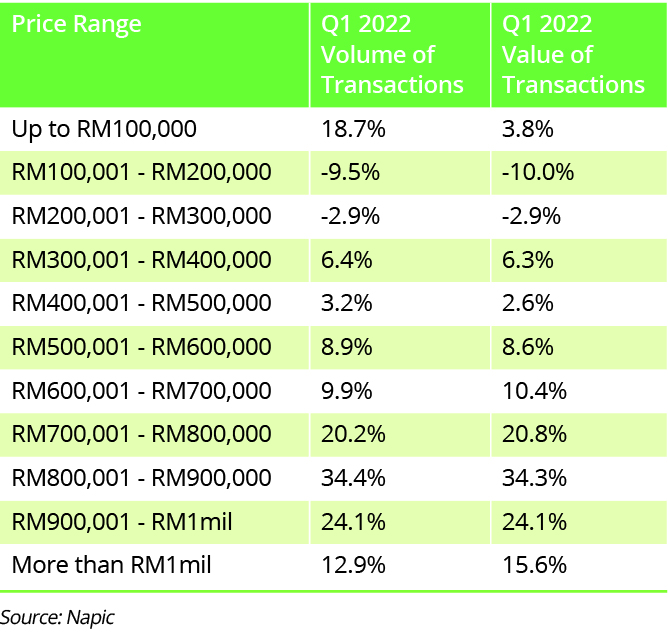 The volume of transactions for properties ranging from RM900,001 to RM1mil came in second at 24.1% in Q1 2022 when compared to the corresponding period of Q1 2021 while properties ranging from RM700,001 to RM800,000 was third at 20.2% for the same period.