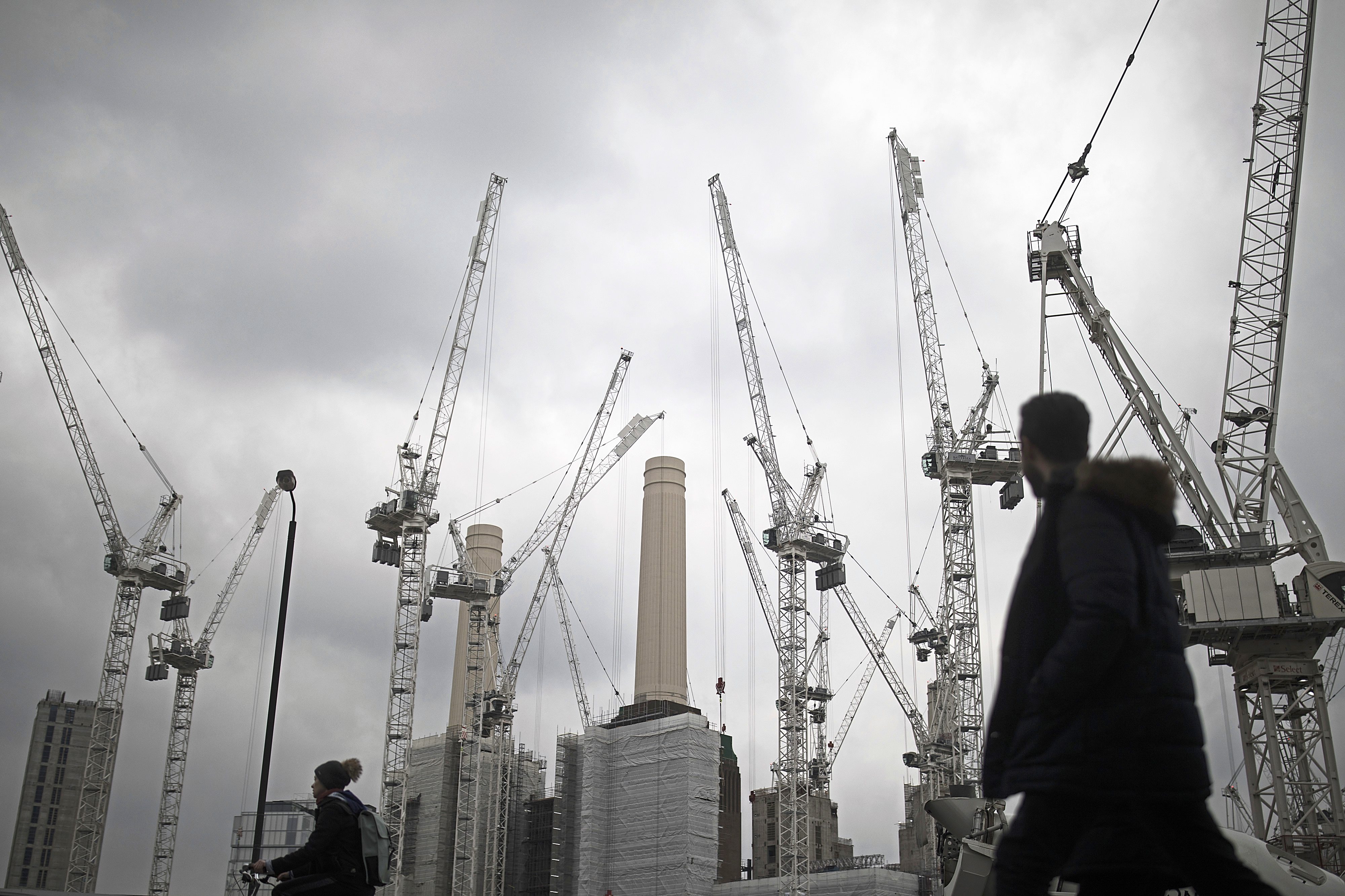 Construction cranes stand above the Battersea Power Station office, retail and residential development in the Nine Elms district in London, UK. Photographer: Simon Dawson/Bloomberg