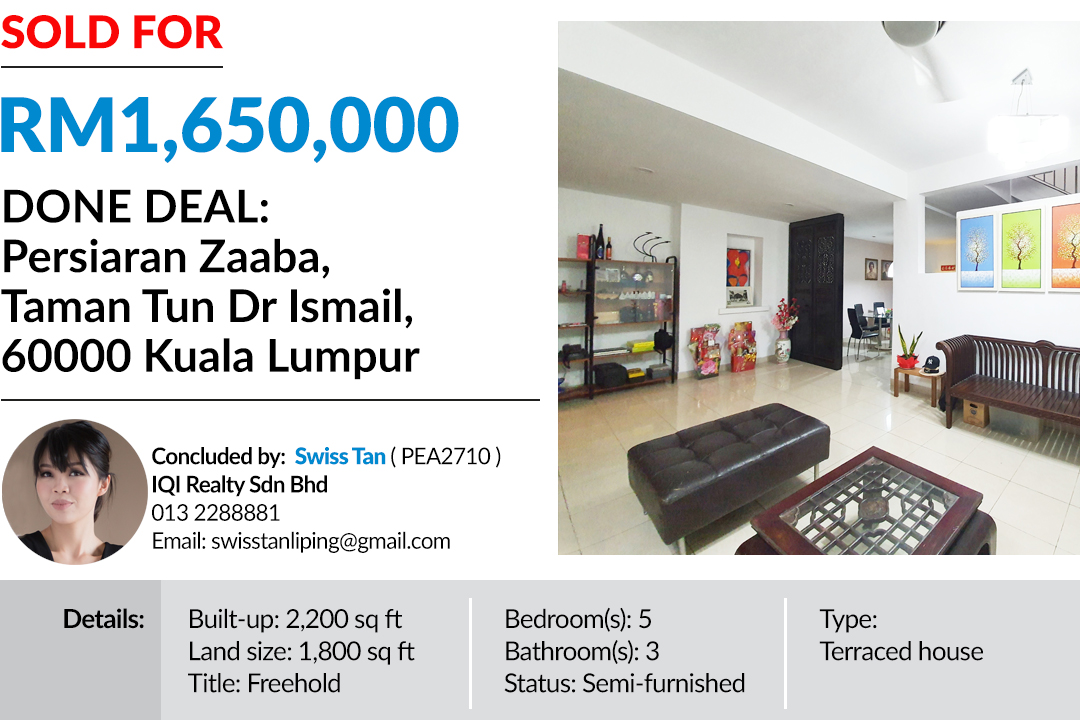 Property agency IQI Realty Sdn Bhd’s Swiss Tan has been working hard over the past few months, landing several sales including this terraced house in Taman Tun Dr Ismail, Kuala Lumpur for her client. She also made another sale in this suburb recently involving a bungalow for RM4.9mil. View the details of her other transaction here.