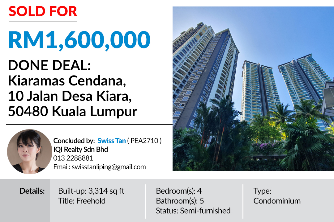 Property agency IQI Realty Sdn Bhd’s Swiss Tan assisted in the sale of this freehold condominium penthouse in Mont Kiara, Kuala Lumpur. View the details of her other transactions in Petaling Jaya, Taman Tun Dr Ismail, Bukit Damansara and SS2.
