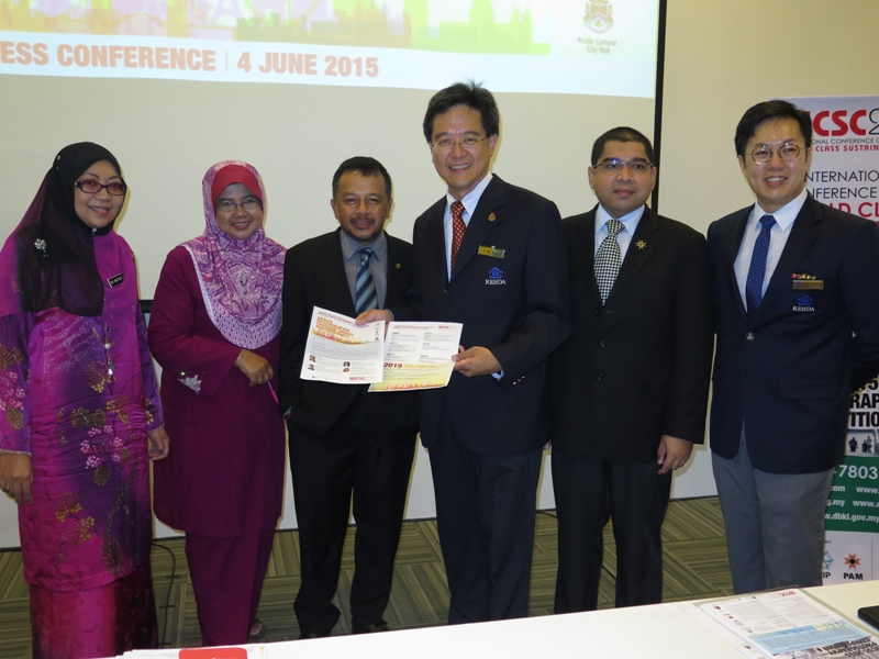 Present at the press conference: (From left) Pn Nik Mastura Diyana bt Nik Mohamad from DBKL, MIP past president Khairiah Mohd Talha, MIP president Tn Md Nazri Mohd Noordin, organising chairman of WCSC 2015 and REHDA KL past chairman Datuk N. K. Tong, honorary secretary of PAM Ar Sarizal Yusman Yusoff, and REHDA KL branch secretary Chan Kin Meng.