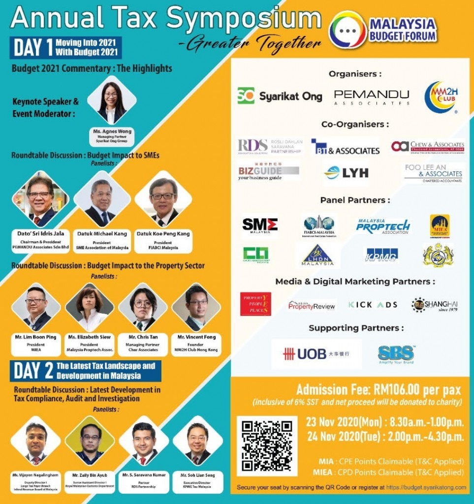 KUALA LUMPUR: The Annual Tax Symposium under the Malaysia Budget Forum is scheduled to be held online on Nov 23 & 24, 2020.The business-focused virtual event will see 12 speakers and panellists cover matters related to Budget 2021 as well as opportunities for businesses and stakeholders in the...