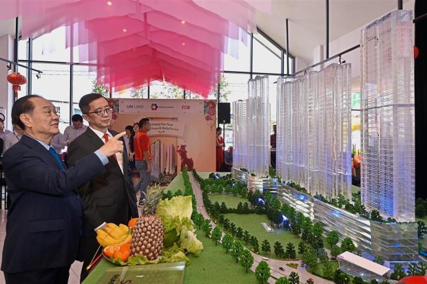 FCW Holdings Bhd chairman Tan Sri Robert Tan (left) and IJM Land Bhd chief executive officer and managing director Datuk Soam Heng Choon looking at a scale model of Riana Dutamas during the Chinese New Year open house at Riana Dutamas Sales Gallery in Jalan Segambut, Kuala Lumpur.IJM Land Bhd and...