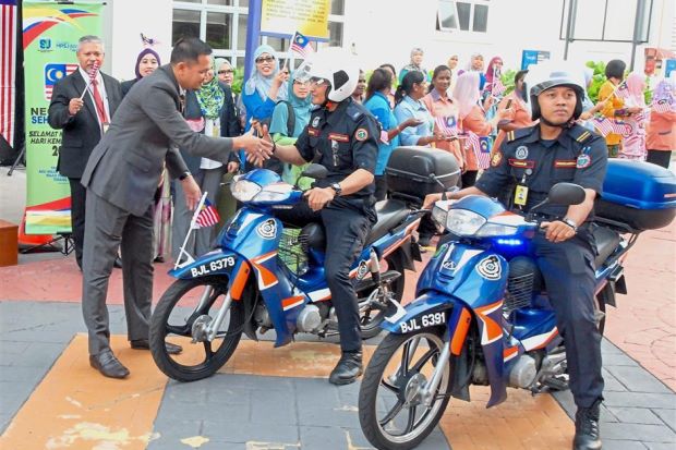Mohd Zulkarnain distributing the Jalur Gemilang to MPSJ enforcement officers during the ‘Kibar Jalur Gemilang’ campaign at the council’s headquarters.MOTORISTS who park at the Subang Jaya Municipal Council (MPSJ) multi-storey parking complex in SS15 will be charged for using the facility...