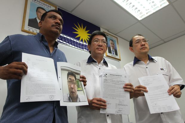 (From left) Ganesan showing his police report and a photograph of the ‘seller’. Also present are Tan and Goh.A FACTORY supervisor thought he would finally own a RM600,000 condominium unit with a panoramic view of Penang Bridge, but after spending RM15,000 and even signing the purchase...