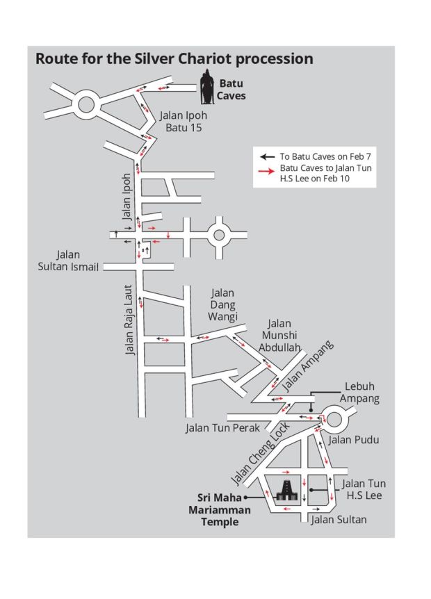 Roads to be closed intermittently for chariot processionBY MELIZARANI T.SELVAIn conjunction with Thaipusam, various roads will be closed to accommodate the Silver Chariot procession that will start tomorrow.It will begin from the Sri Maha Mariamman Temple in Jalan Tun H.S Lee, Kuala Lumpur at 10pm...