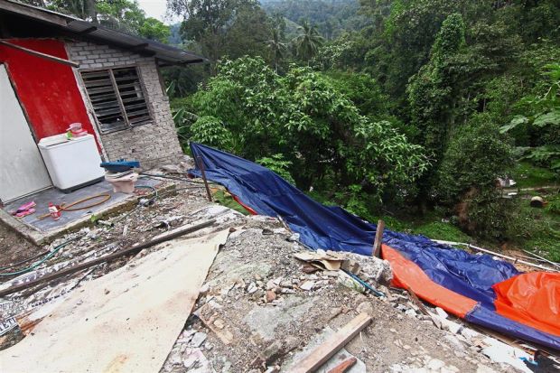A landslip on Dec 24 caused the kitchen of Nur Ains home to collapse into a ravine nearby. Thankfully no one was injured in the incident. — Photos: RAYMOND OOI/ The Star FAMILIES affected by the Dec 24 landslide in Kampung Sungai Rumput, Batu 12, Gombak, returned to their homes on Tuesday.Heavy...