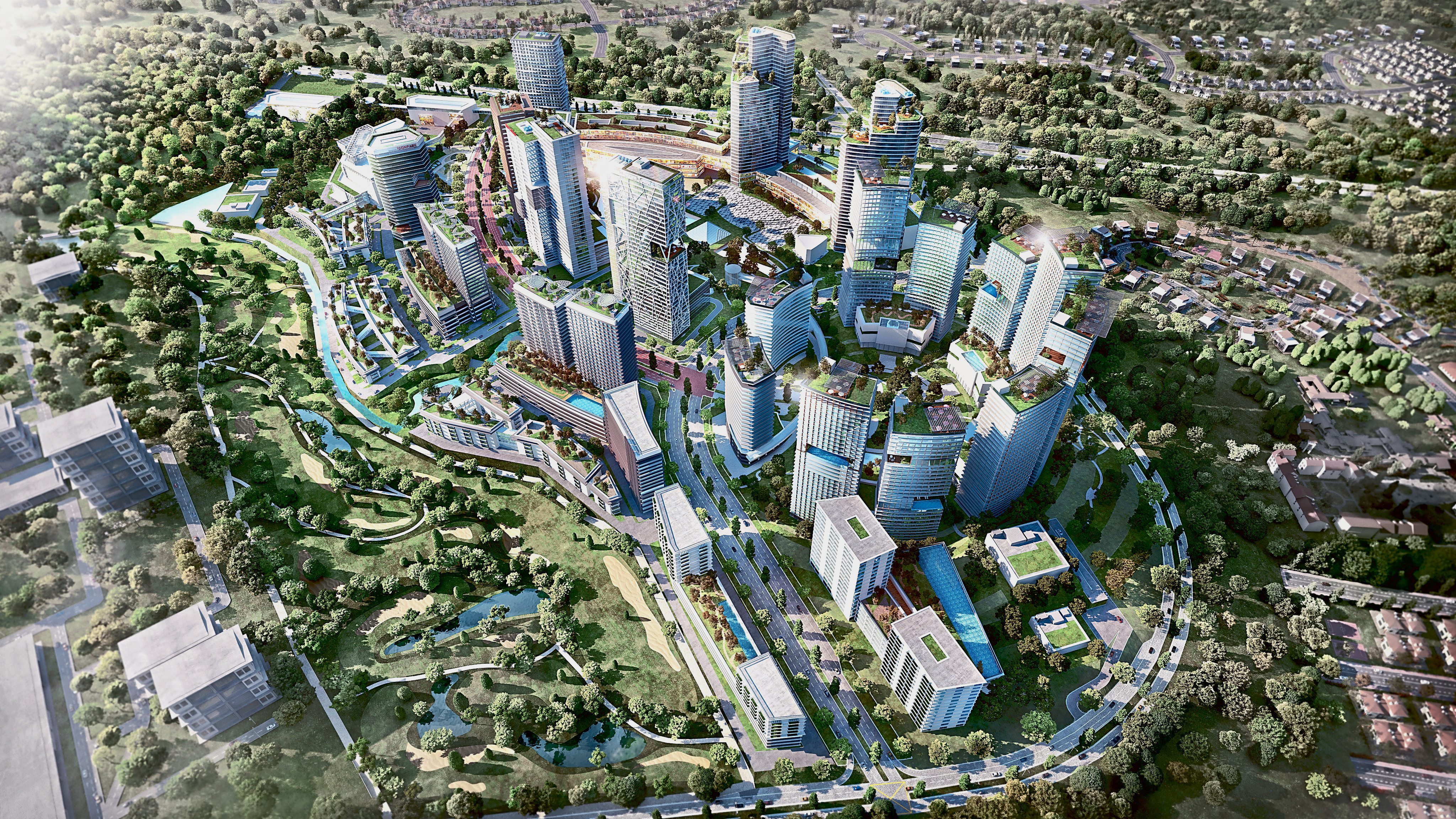 Linear parks, pocket gardens, fountains and a picturesque lake form part of the surrounding landscape.