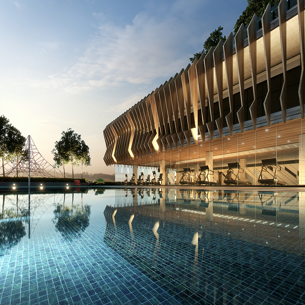 Rising up from ground to the podium, the outdoor lawn will provide an impressive full Olympic-length swimming facility flanked by wet and dry parks for the children, a well-equipped gym complete with three multiuse studios, and a function lawn dedicated to those who enjoy outdoor events with a spectacular view.