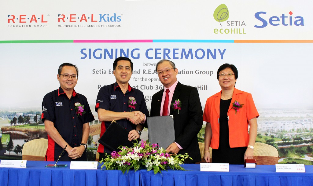 Setia EcoHill Sdn Bhd vice president Tan Hon Lim and R.E.A.L Education Group Sdn Bhd president Ee Ching Wah yesterday inked the agreement at Setia EcoHill sales gallery, which was witnessed by Setia EcoHill general manager Koh Sooi Meng and R.E.A.L Kids general manager Rachel Leow.
