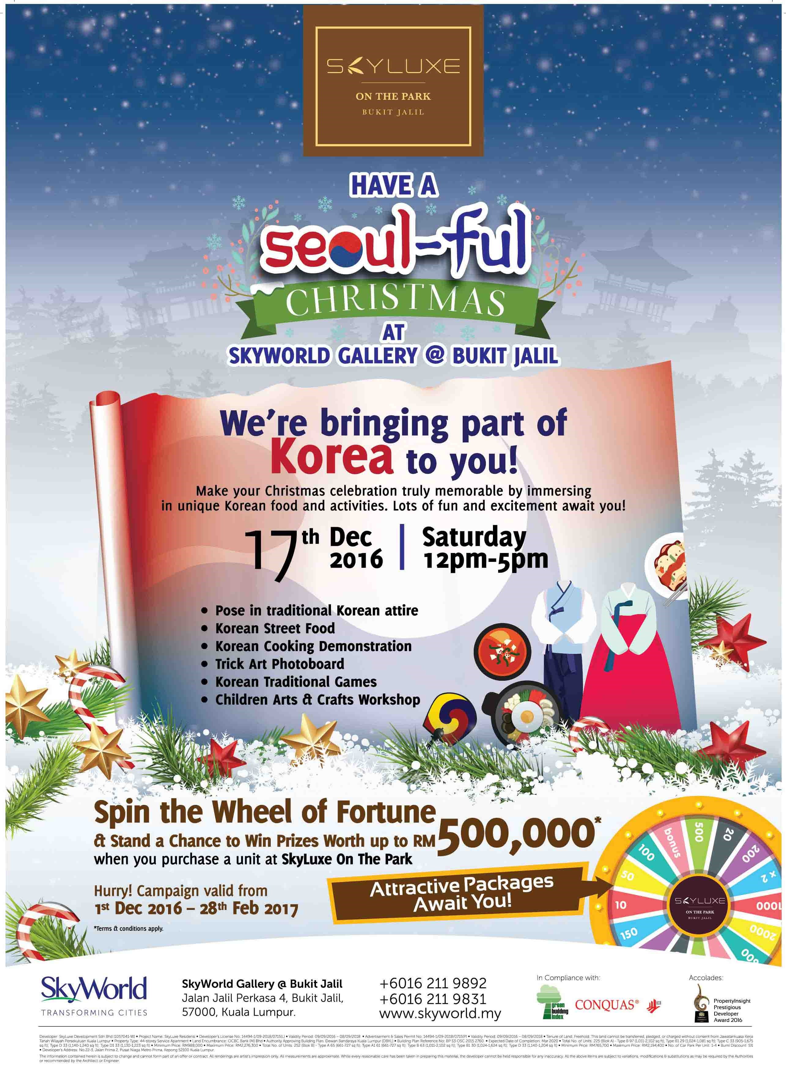 Highlights: Spin the wheel of fortune, chance to post in traditional Korean costume and savour Korean street food, children arts & crafts workshop and try your hand at Korean traditional games and cooking demonstrations! For more info, visit www.skyluxe.com.my.