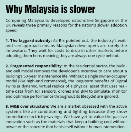 Furthermore, Toh identifies a systemic deterrent, namely, the stratified nature of Malaysian residential property. In a commercial tower, a single owner benefits from long-term maintenance savings. In a stratified residential project, the developer exits after construction and the maintenance falls to a fragmented group of owners. "Developers have little to no interest post-sales and construction," Toh noted, highlighting a fundamental misalignment of incentives.