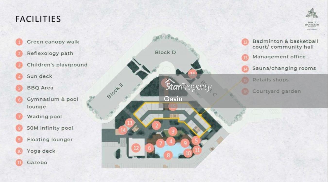 FACILITIES Reflexology path Sun deck Floating lounger Yoga deck Gazebo Courtyard garden Gym rooms & pool lounge BBQ Area Children playground Community hall / badminton & basketball court Sauna rooms Jogging track Swimming pool Co working space Green canopy walk Retail shops for future development(grocery, restaurant, cafe, laundry, entertainment).